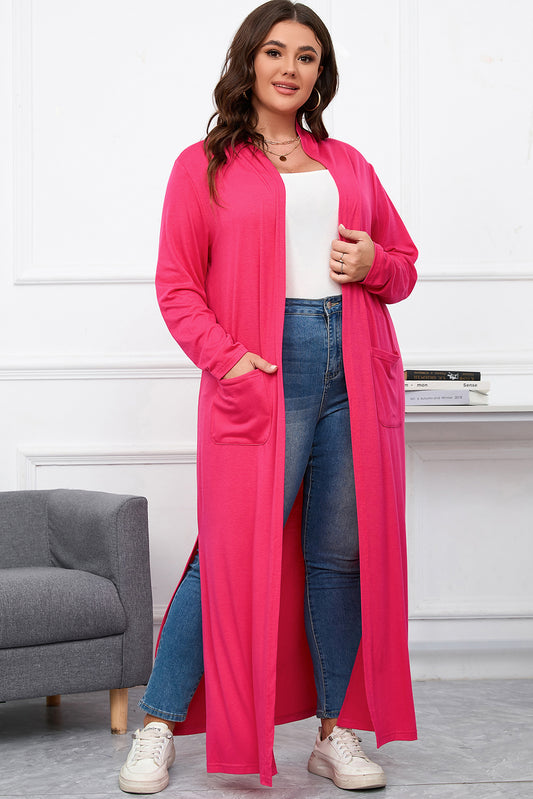 Strawberry Pink Plus Size Side Split Pockets Duster Cardigan