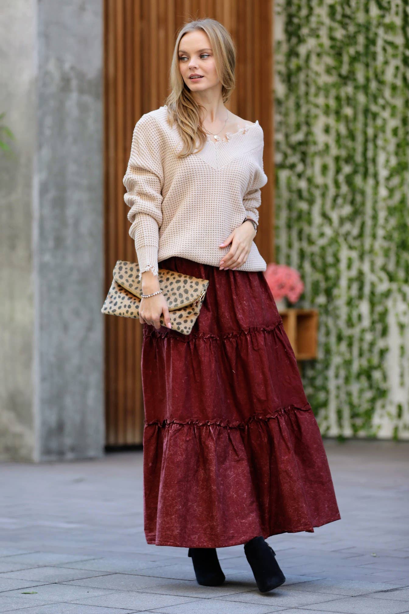 SI-23133 Plus Wash Drawstring Waist Tiered Ruffle Maxi Skirt (100% COTTON)