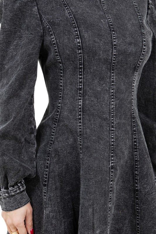 Denim cute dress with a round neckline, long sleeves, back zipper up